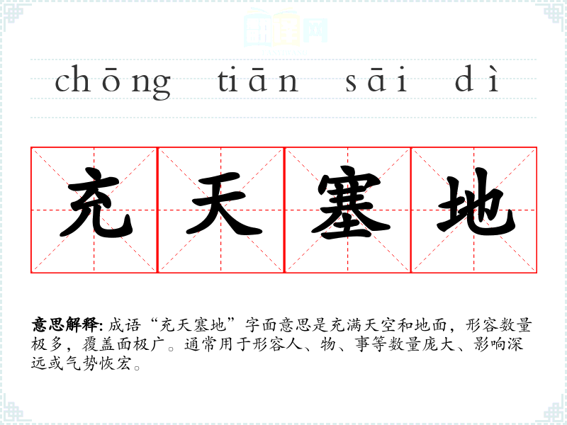 成语“充天塞地”字面意思是充满天空和地面,形容数量极多,覆盖面极广。通常用于形容人、物、事等数量庞大、影响深远或气势恢宏。