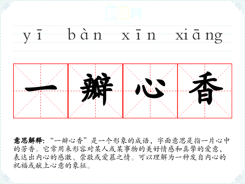 “一瓣心香”最早出现在元代的杂剧中,后来逐渐流传开来。成语中的“瓣”指瓣片,常见于花瓣,而“心香”则象征内心的美好情感。成语的历史背景反映了古人对情感的细腻表达,强调了真诚与美好的感情。