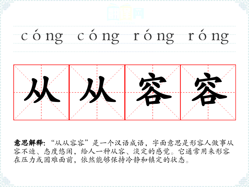 “从从容容”是一个汉语成语,字面意思是形容人做事从容不迫、态度悠闲,给人一种从容、淡定的感觉。它通常用来形容在压力或困难面前,依然能够保持冷静和镇定的状态。