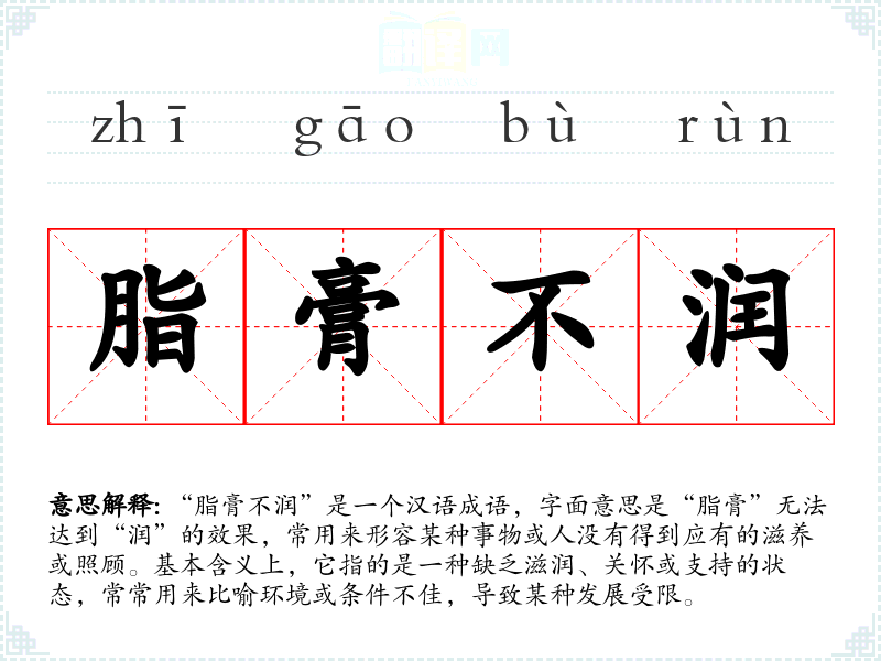 “脂膏不润”是一个汉语成语,字面意思是“脂膏”无法达到“润”的效果,常用来形容某种事物或人没有得到应有的滋养或照顾。基本含义上,它指的是一种缺乏滋润、关怀或支持的状态,常常用来比喻环境或条件不佳,导致某种发展受限。