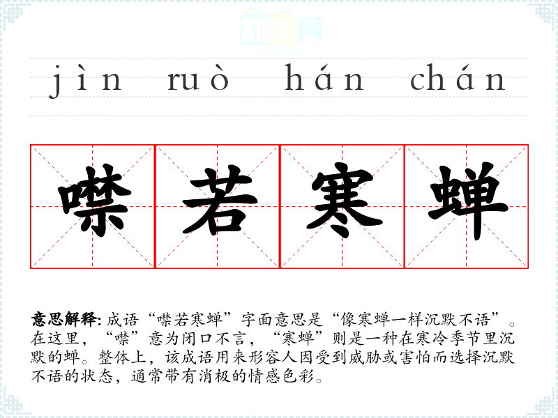 成语“噤若寒蝉”字面意思是“像寒蝉一样沉默不语”。在这里,“噤”意为闭口不言,“寒蝉”则是一种在寒冷季节里沉默的蝉。整体上,该成语用来形容人因受到威胁或害怕而选择沉默不语的状态,通常带有消极的情感色彩。
