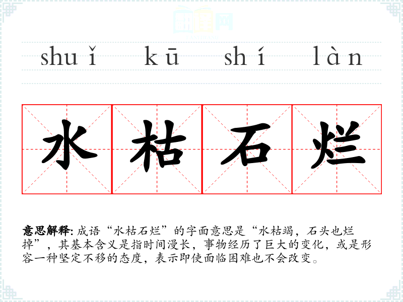 成语“水枯石烂”的字面意思是“水枯竭,石头也烂掉”,其基本含义是指时间漫长,事物经历了巨大的变化,或是形容一种坚定不移的态度,表示即使面临困难也不会改变。