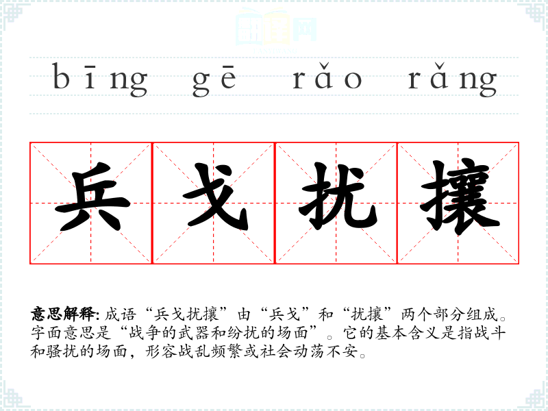 成语“兵戈扰攘”由“兵戈”和“扰攘”两个部分组成。字面意思是“战争的武器和纷扰的场面”。它的基本含义是指战斗和骚扰的场面,形容战乱频繁或社会动荡不安。