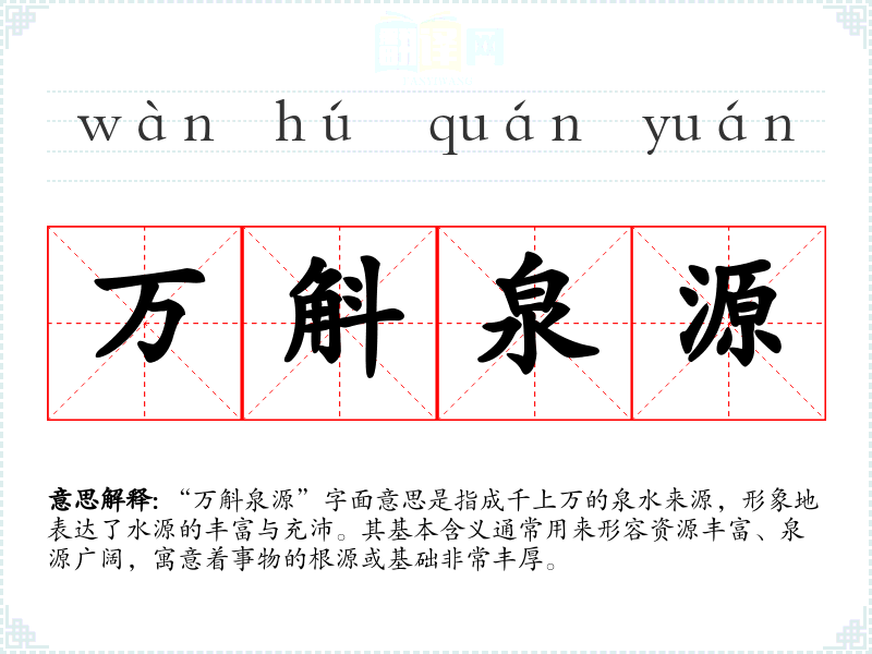 “万斛泉源”字面意思是指成千上万的泉水来源,形象地表达了水源的丰富与充沛。其基本含义通常用来形容资源丰富、泉源广阔,寓意着事物的根源或基础非常丰厚。