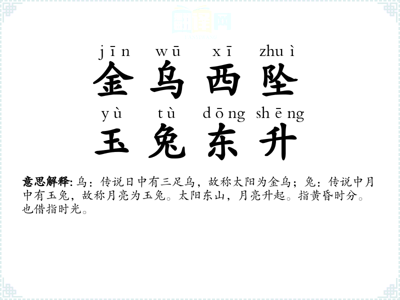 兔、乌:古代神话传说中说,月亮里有玉兔,太阳里有三足金乌,所以用乌、兔代表日月。月亮东升,太阳西落。表示时光不断流逝。 |