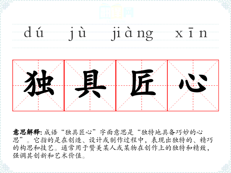 成语“独具匠心”字面意思是“独特地具备巧妙的心思”。它指的是在创造、设计或制作过程中,表现出独特的、精巧的构思和技艺。通常用于赞美某人或某物在创作上的独特和精致,强调其创新和艺术价值。