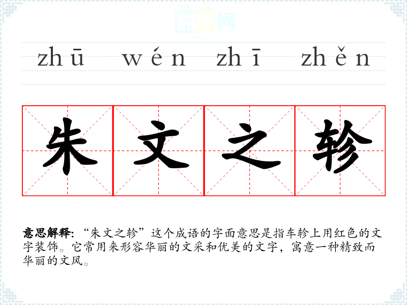 “朱文之轸”这个成语的字面意思是指车轸上用红色的文字装饰。它常用来形容华丽的文采和优美的文字,寓意一种精致而华丽的文风。