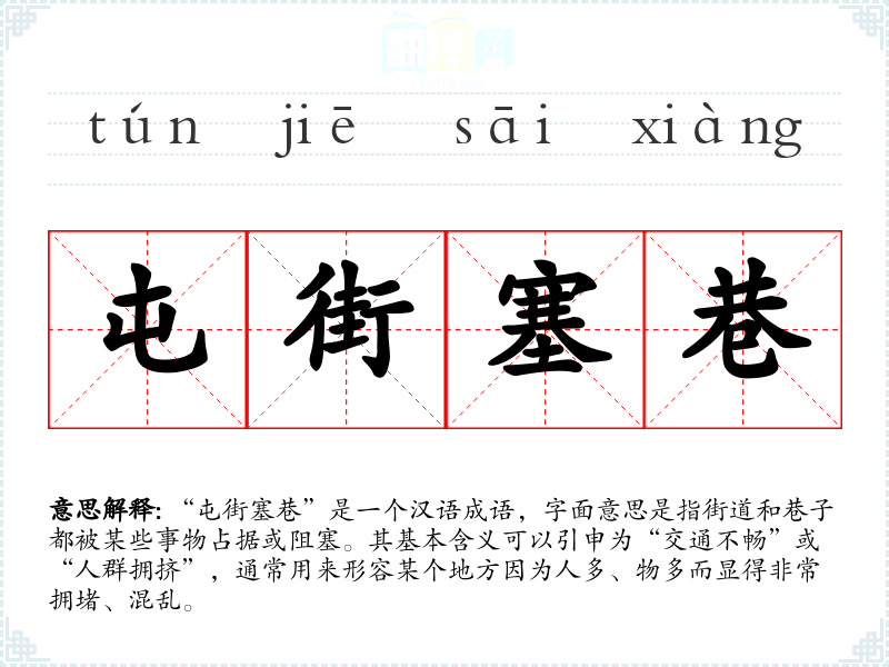 “屯街塞巷”是一个汉语成语,字面意思是指街道和巷子都被某些事物占据或阻塞。其基本含义可以引申为“交通不畅”或“人群拥挤”,通常用来形容某个地方因为人多、物多而显得非常拥堵、混乱。