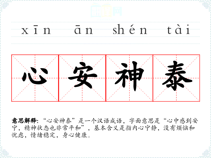 “心安神泰”是一个汉语成语,字面意思是“心中感到安宁,精神状态也非常平和”,基本含义是指内心宁静,没有烦恼和忧虑,情绪稳定,身心健康。