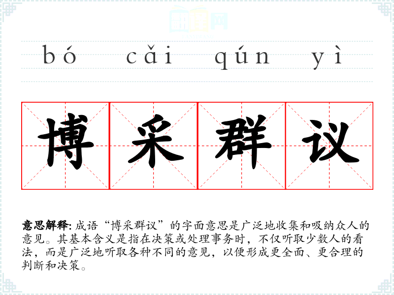 成语“博采群议”的字面意思是广泛地收集和吸纳众人的意见。其基本含义是指在决策或处理事务时,不仅听取少数人的看法,而是广泛地听取各种不同的意见,以便形成更全面、更合理的判断和决策。