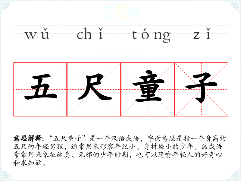 “五尺童子”这个成语源于古代汉语文学,尤其是《诗经》和《楚辞》中对少年形象的描绘。具体的出处不易考证,但通常与对年轻人纯真和天真烂漫的描绘有关。它可能与古代的身高标准有关,古时五尺的高度大致相当于现代的1*0厘米左右,指的是一个刚步入少年期的孩子。