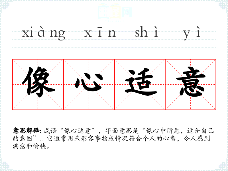 成语“像心适意”,字面意思是“像心中所愿,适合自己的意图”。它通常用来形容事物或情况符合个人的心意,令人感到满意和愉快。