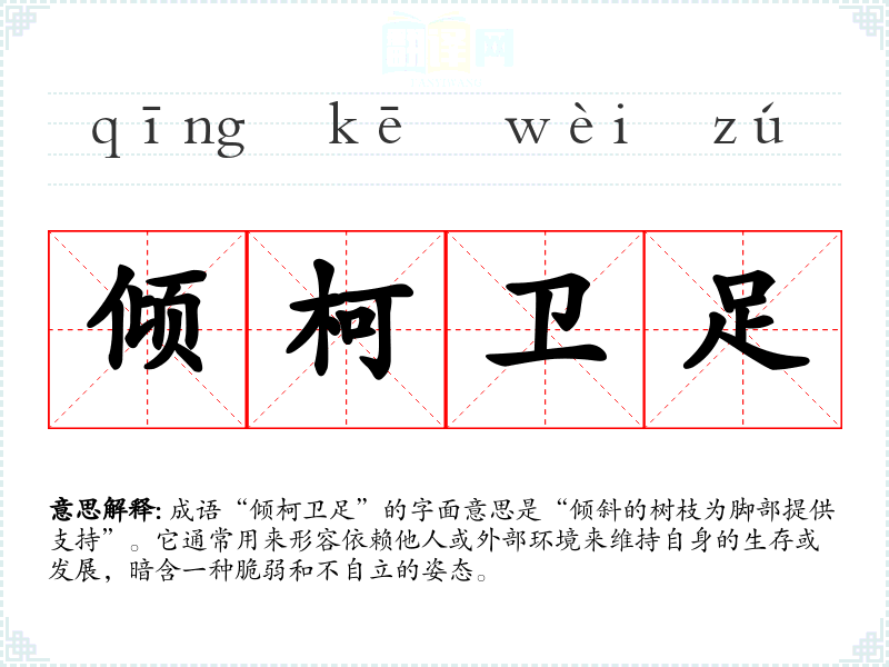 成语“倾柯卫足”的字面意思是“倾斜的树枝为脚部提供支持”。它通常用来形容依赖他人或外部环境来维持自身的生存或发展,暗含一种脆弱和不自立的姿态。