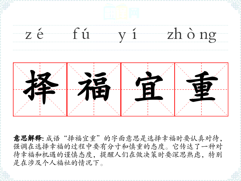 成语“择福宜重”的字面意思是选择幸福时要认真对待,强调在选择幸福的过程中要有分寸和慎重的态度。它传达了一种对待幸福和机遇的谨慎态度,提醒人们在做决策时要深思熟虑,特别是在涉及个人福祉的情况下。