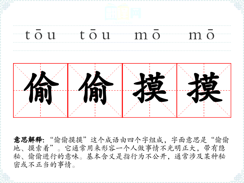 “偷偷摸摸”这个成语由四个字组成,字面意思是“偷偷地、摸索着”。它通常用来形容一个人做事情不光明正大,带有隐秘、偷偷进行的意味。基本含义是指行为不公开,通常涉及某种秘密或不正当的事情。