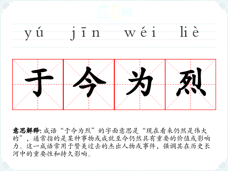 成语“于今为烈”的字面意思是“现在看来仍然是伟大的”,通常指的是某种事物或成就至今仍然具有重要的价值或影响力。这一成语常用于赞美过去的杰出人物或**,强调其在历史长河中的重要性和持久影响。