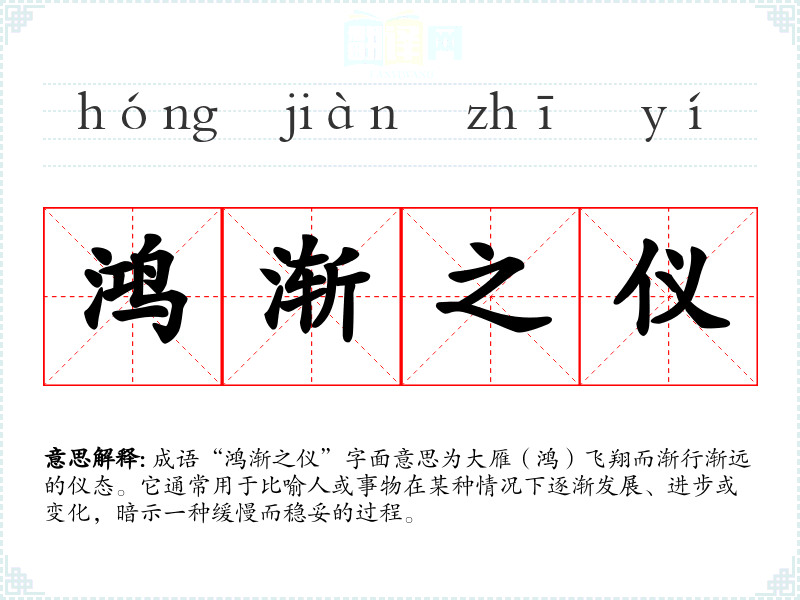 - 循序渐进:指按照一定的顺序逐步前进,与“鸿渐之仪”相似,强调过程的稳妥。