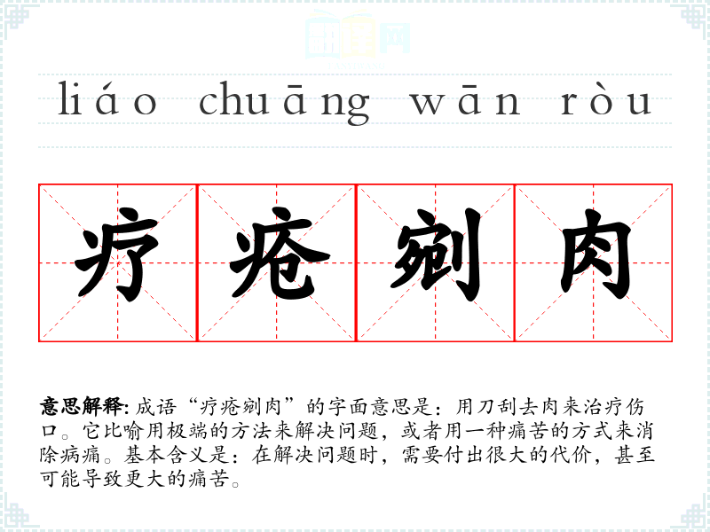 成语“疗疮剜肉”的字面意思是:用刀刮去肉来治疗伤口。它比喻用极端的方法来解决问题,或者用一种痛苦的方式来消除病痛。基本含义是:在解决问题时,需要付出很大的代价,甚至可能导致更大的痛苦。
