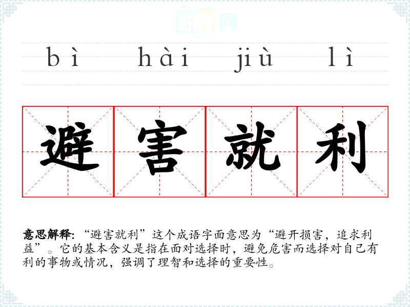 “避害就利”这个成语字面意思为“避开损害,追求利益”。它的基本含义是指在面对选择时,避免危害而选择对自己有利的事物或情况,强调了理智和选择的重要性。