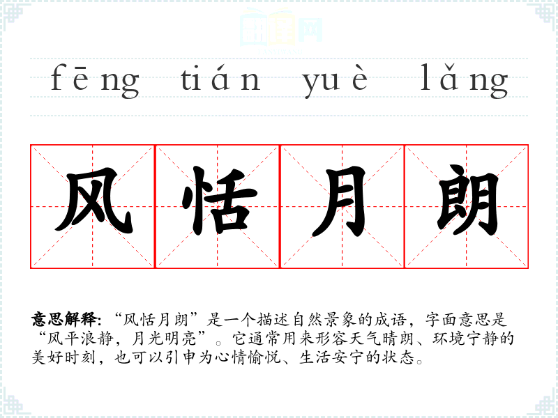 “风恬月朗”是一个描述自然景象的成语,字面意思是“风平浪静,月光明亮”。它通常用来形容天气晴朗、环境宁静的美好时刻,也可以引申为心情愉悦、生活安宁的状态。