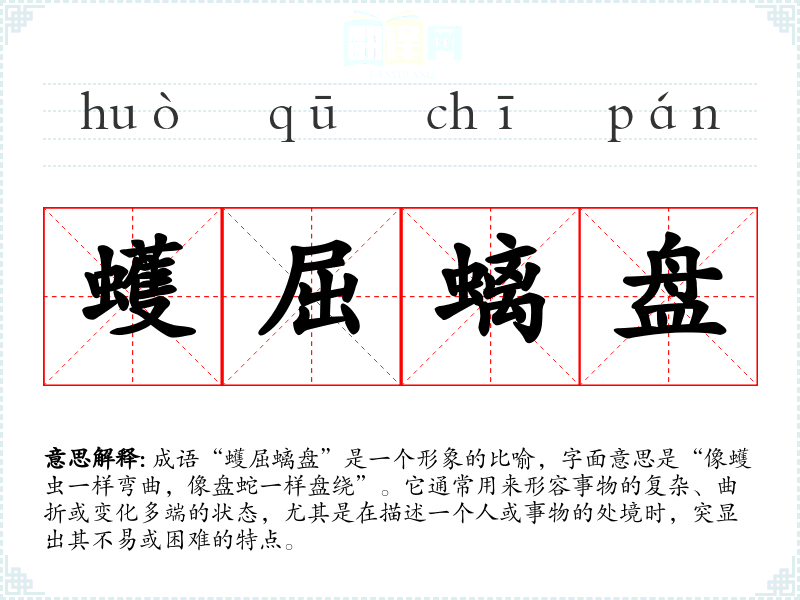 成语“蠖屈螭盘”是一个形象的比喻,字面意思是“像蠖虫一样弯曲,像盘蛇一样盘绕”。它通常用来形容事物的复杂、曲折或变化多端的状态,尤其是在描述一个人或事物的处境时,突显出其不易或困难的特点。