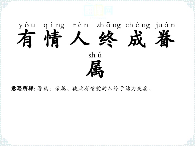 眷属:亲属。彼此有情爱的人终于结为夫妻。 |