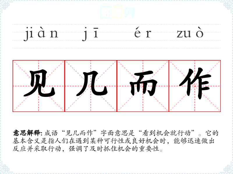 成语“见几而作”字面意思是“看到机会就行动”。它的基本含义是指人们在遇到某种可行性或良好机会时,能够迅速做出反应并采取行动,强调了及时抓住机会的重要性。