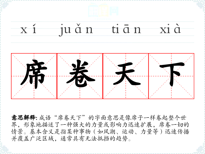 成语“席卷天下”的字面意思是像席子一样卷起整个世界,形象地描述了一种强大的力量或影响力迅速扩展,席卷一切的情景。基本含义是指某种事物(如风潮、**、力量等)迅速传播并覆盖广泛区域,通常具有无法抵挡的趋势。