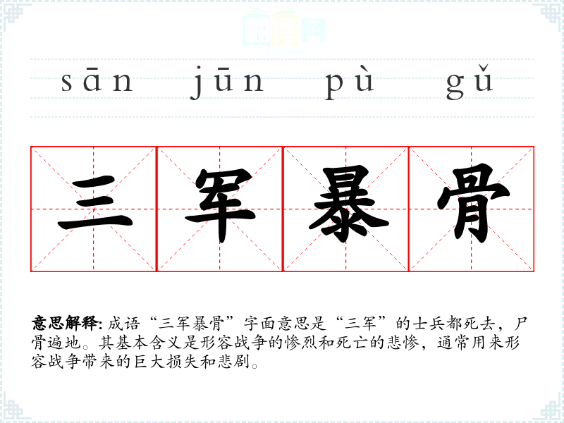 成语“三军暴骨”字面意思是“三军”的士兵都死去,尸骨遍地。其基本含义是形容战争的惨烈和死亡的悲惨,通常用来形容战争带来的巨大损失和悲剧。