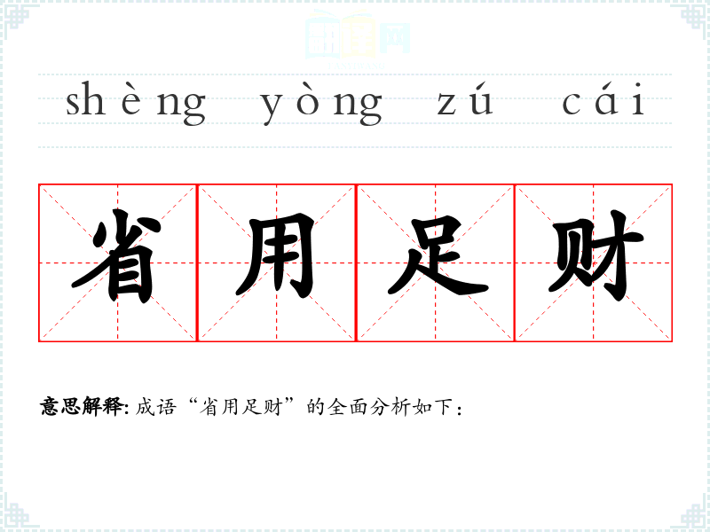 “省用足财”字面意思是节省使用,充足的财富。它强调在资源的使用上要精打细算,合理规划,从而达到既节省又不失充足的效果。基本含义是提倡节俭和合理利用资源。