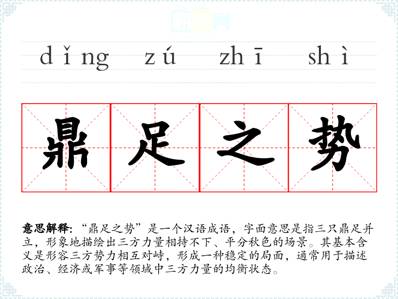 - 三足鼎立:与“鼎足之势”相似,强调三方平衡。