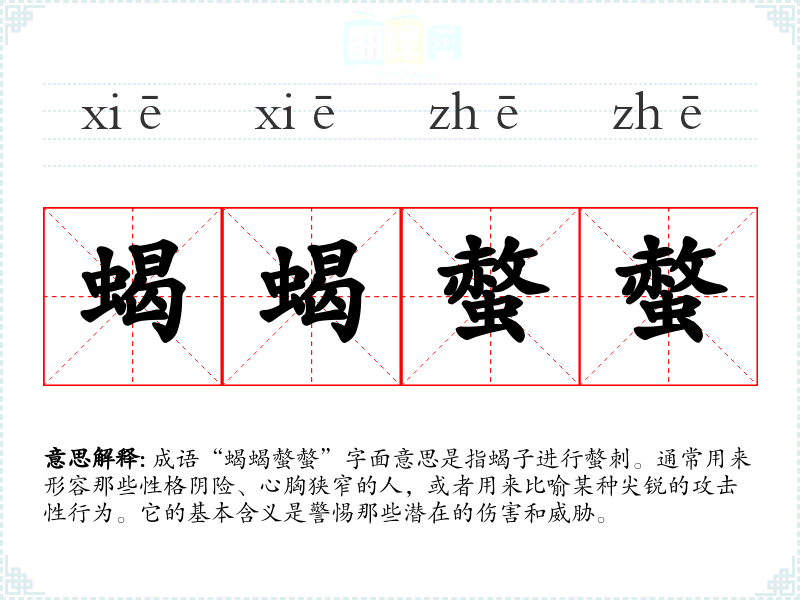 成语“蝎蝎螫螫”字面意思是指蝎子进行螫刺。通常用来形容那些性格阴险、心胸狭窄的人,或者用来比喻某种尖锐的攻击性行为。它的基本含义是警惕那些潜在的伤害和威胁。
