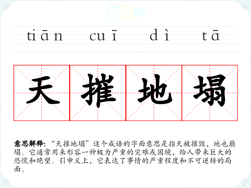 “天摧地塌”这个成语的字面意思是指天被摧毁,地也崩塌。它通常用来形容一种极为严重的灾难或困境,给人带来巨大的恐慌和绝望。引申义上,它表达了事情的严重程度和不可逆转的局面。