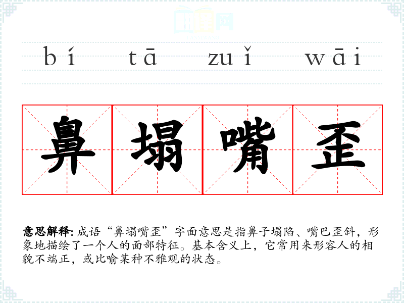 成语“鼻塌嘴歪”字面意思是指鼻子塌陷、嘴巴歪斜,形象地描绘了一个人的面部特征。基本含义上,它常用来形容人的相貌不端正,或比喻某种不雅观的状态。