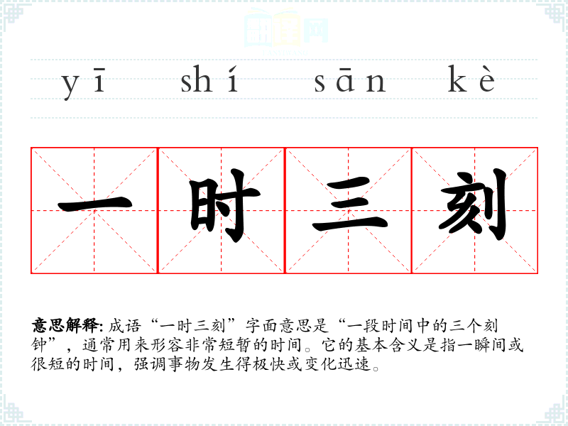 成语“一时三刻”字面意思是“一段时间中的三个刻钟”,通常用来形容非常短暂的时间。它的基本含义是指一瞬间或很短的时间,强调事物发生得极快或变化迅速。