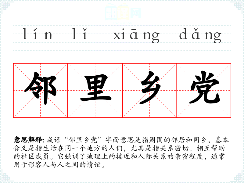 成语“邻里乡党”字面意思是指周围的邻居和同乡,基本含义是指生活在同一个地方的人们,尤其是指关系密切、相互帮助的社区成员。它强调了地理上的接近和人际关系的亲密程度,通常用于形容人与人之间的情谊。