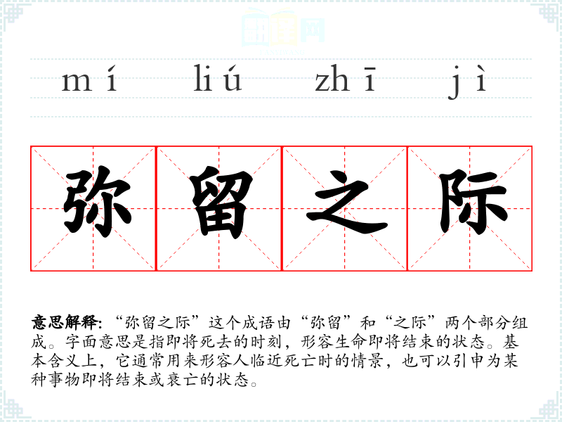 “弥留之际”这个成语由“弥留”和“之际”两个部分组成。字面意思是指即将死去的时刻,形容生命即将结束的状态。基本含义上,它通常用来形容人临近死亡时的情景,也可以引申为某种事物即将结束或衰亡的状态。