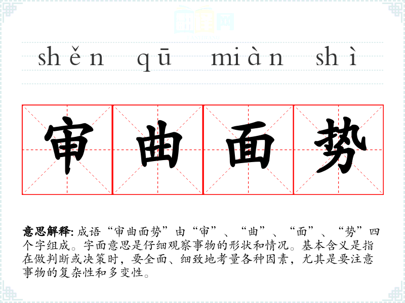 成语“审曲面势”由“审”、“曲”、“面”、“势”四个字组成。字面意思是仔细观察事物的形状和情况。基本含义是指在做判断或决策时,要全面、细致地考量各种因素,尤其是要注意事物的复杂性和多变性。