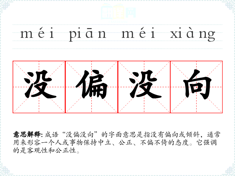 成语“没偏没向”的字面意思是指没有偏向或倾斜,通常用来形容一个人或事物保持中立、公正、不偏不倚的态度。它强调的是客观性和公正性。