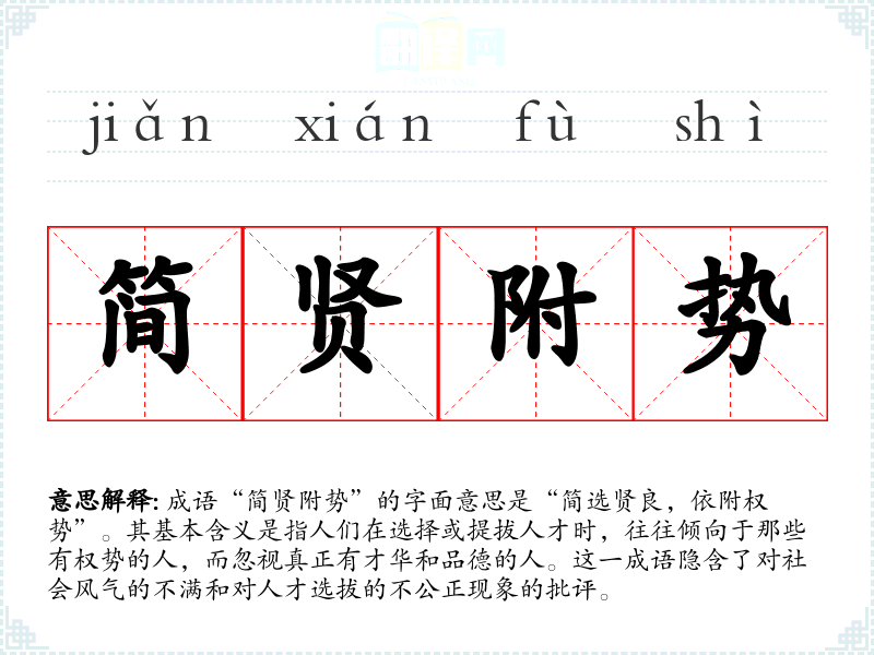 成语“简贤附势”的字面意思是“简选贤良,依附权势”。其基本含义是指人们在选择或提拔人才时,往往倾向于那些有权势的人,而忽视真正有才华和品德的人。这一成语隐含了对社会风气的不满和对人才选拔的不公正现象的批评。