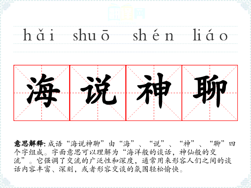 成语“海说神聊”由“海”、“说”、“神”、“聊”四个字组成。字面意思可以理解为“海洋般的谈话,神仙般的交流”。它强调了交流的广泛性和深度,通常用来形容人们之间的谈话内容丰富、深刻,或者形容交谈的氛围轻松愉快。