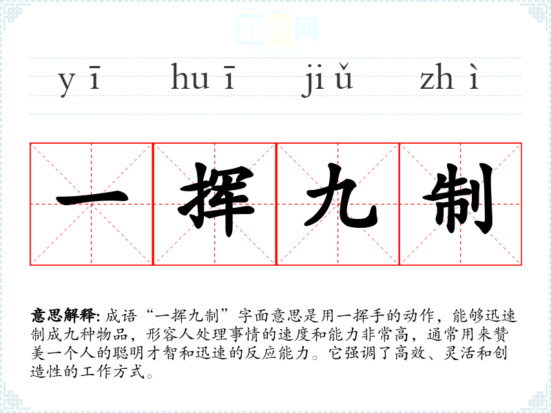 “一挥九制”在**传统文化中,常常与智者和能干的人物联系在一起,体现了对聪明才智的尊重。在现代社会,随着快节奏的生活和工作方式,这一成语的使用更加普遍,强调了效率和创造力的重要性。