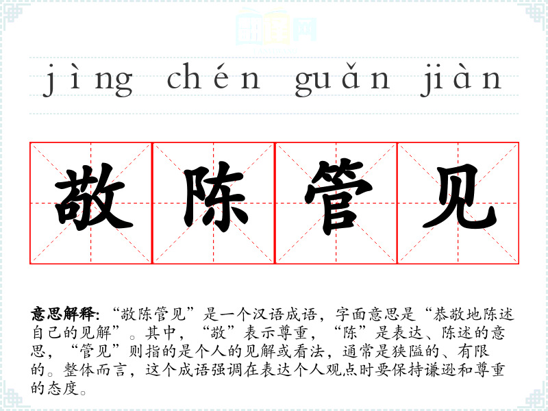 “敬陈管见”是一个汉语成语,字面意思是“恭敬地陈述自己的见解”。其中,“敬”表示尊重,“陈”是表达、陈述的意思,“管见”则指的是个人的见解或看法,通常是狭隘的、有限的。整体而言,这个成语强调在表达个人观点时要保持谦逊和尊重的态度。