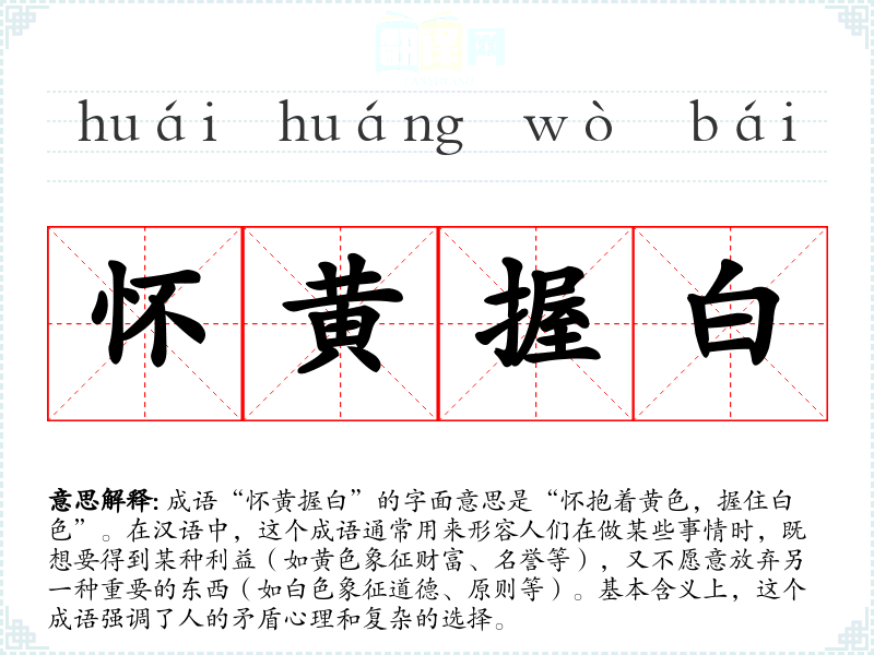 在英语中,类似的表达可能是“Caught between a rock and a hard place”,指在两种困难选择中难以取舍。然而,中文的“怀黄握白”在色彩象征上更为细腻,强调了利益与道德的对立。