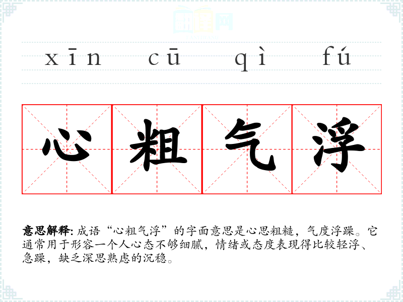 “心粗气浮”并没有明确的历史典故或文学出处,但它反映了**传统文化中对性格和气质的重视。古代文人常通过笔墨描绘人物的内心世界与外在表现,因而对“心”和“气”的描述便成为了对人性和行为的观察。