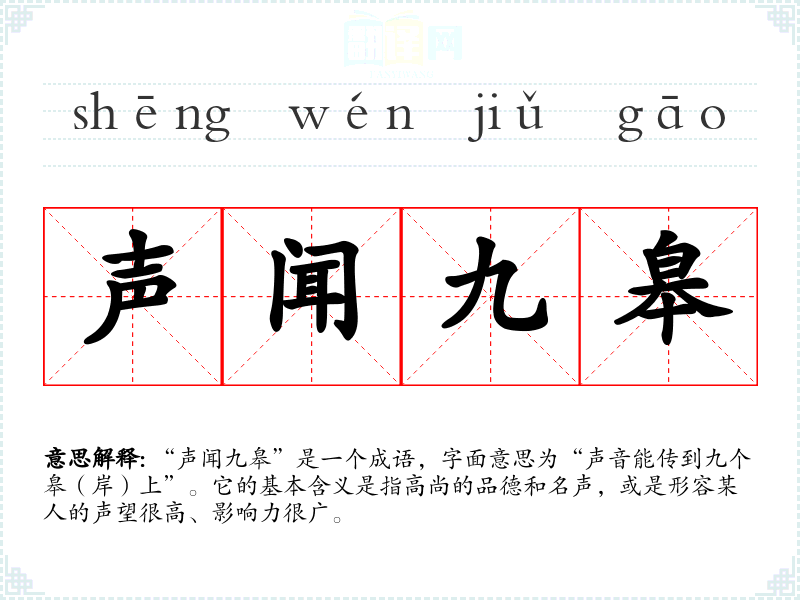 “声闻九皋”是一个成语,字面意思为“声音能传到九个皋(岸)上”。它的基本含义是指高尚的品德和名声,或是形容某人的声望很高、影响力很广。