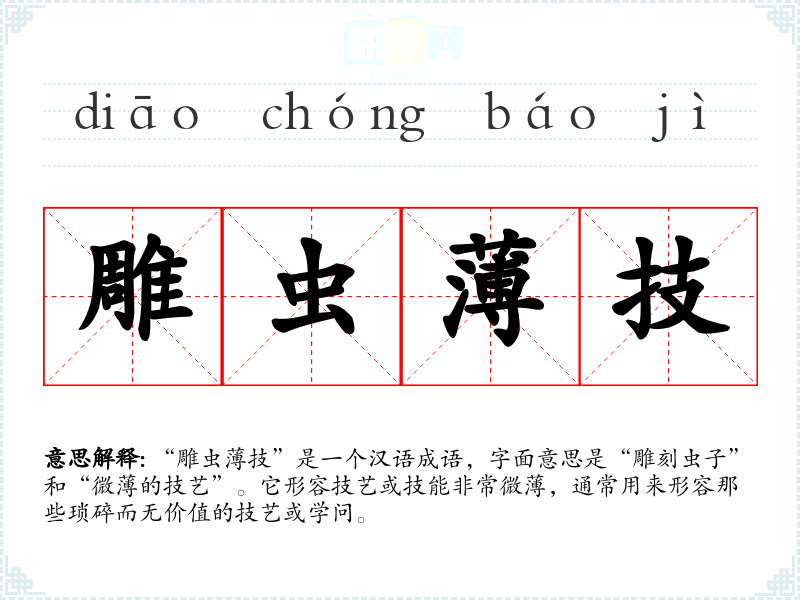 “雕虫技”是一个汉语成语,字面意思是“雕刻虫子”和“微的技艺”。它形容技艺或技能非常微*,通常用来形容那些琐碎而无价值的技艺或学问。