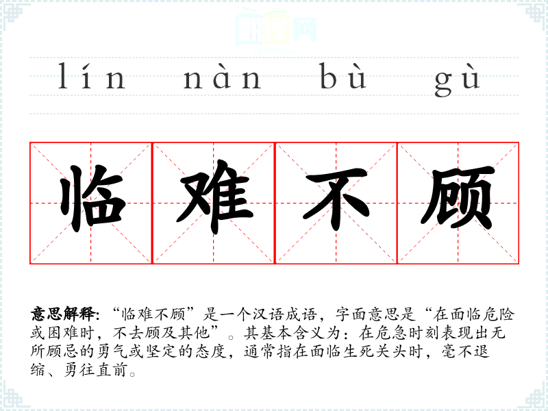 “临难不顾”是一个汉语成语,字面意思是“在面临危险或困难时,不去顾及其他”。其基本含义为:在危急时刻表现出无所顾忌的勇气或坚定的态度,通常指在面临生死关头时,毫不退缩、勇往直前。
