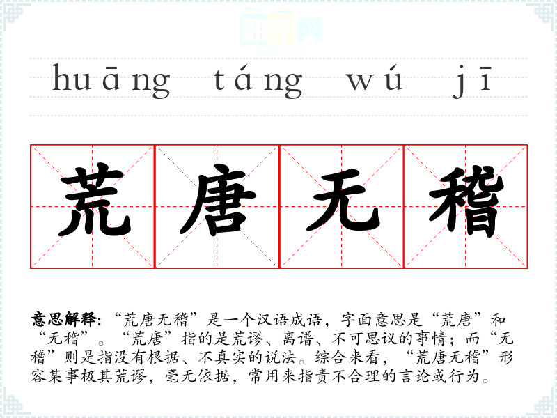 “荒唐无稽”是一个汉语成语,字面意思是“荒唐”和“无稽”。“荒唐”指的是荒谬、离谱、不可思议的事情;而“无稽”则是指没有根据、不真实的说法。综合来看,“荒唐无稽”形容某事极其荒谬,毫无依据,常用来指责不合理的言论或行为。