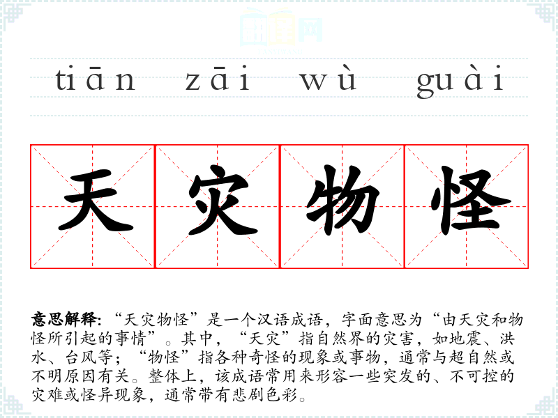 “天灾物怪”是一个汉语成语,字面意思为“由天灾和物怪所引起的事情”。其中,“天灾”指自然界的灾害,如地震、洪水、台风等;“物怪”指各种奇怪的现象或事物,通常与超自然或不明原因有关。整体上,该成语常用来形容一些突发的、不可控的灾难或怪异现象,通常带有悲剧色彩。